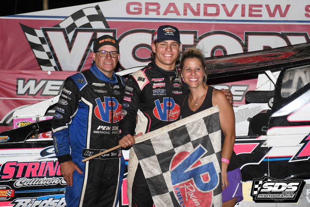 Logan Watt charged from his 13th starting position and on lap 21 made the passed Ray Swinehart for the lead to take his career first modified win at Grandview Speedway.
