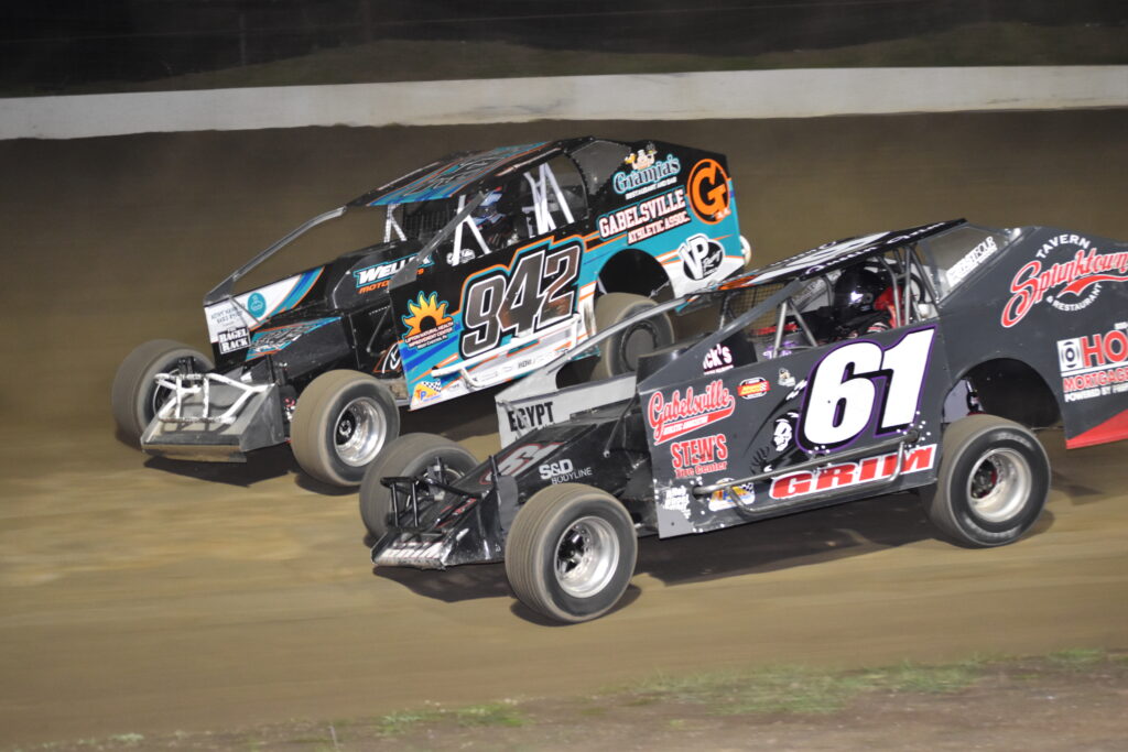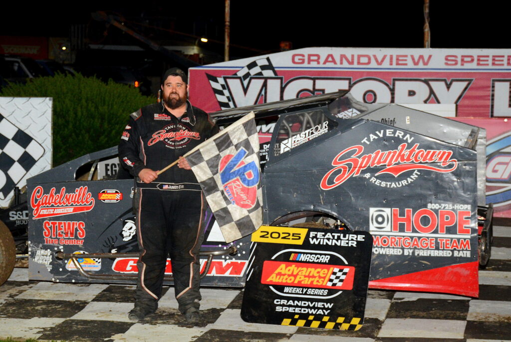 Justin Grim methodically moved through the field from his 6th starting position to take the lead from Ron Haring Jr on lap 23 and then held off a late charge by Eddie Strada to take his first trip to Grandview’s victory lane – “A dream come true.”