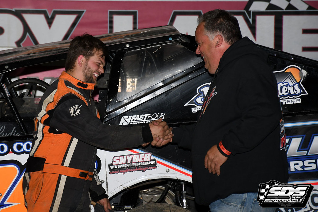 In victory lane Dylan noted “Track tonight was absolutely racy with multi grooves providing two lanes of racing on a perfect surface. I got the 5 to turn under the slider and then won the drag race to the line. I am thankful for Ron Saltzmann of Fast Four shocks he made the changes, and the track came to us just like he said it would.”