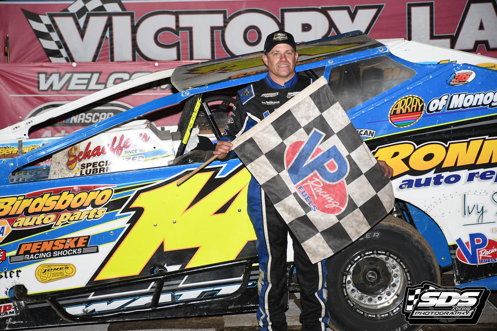 Ryan Watt passed Ray Swinehart on lap 19 to move into 2nd place then chasing and passing leader Ryan Graver for the lead on lap 28 while holding off son Logan on the final lap for the win.