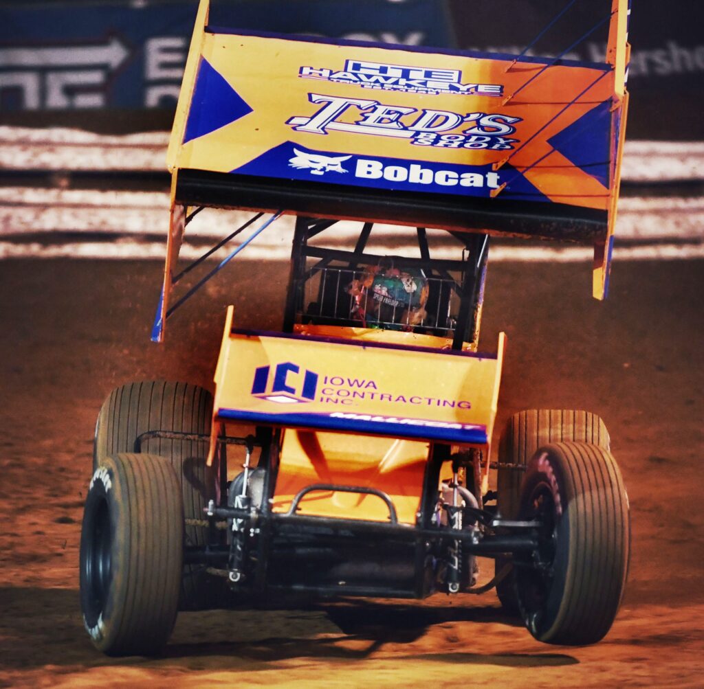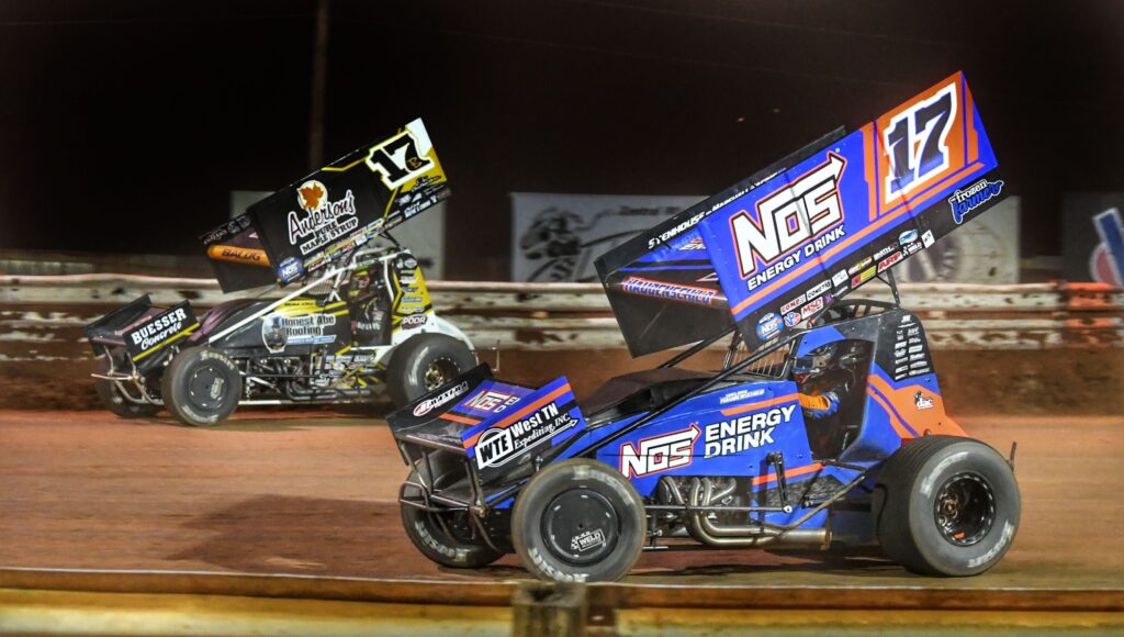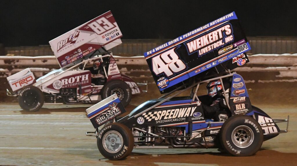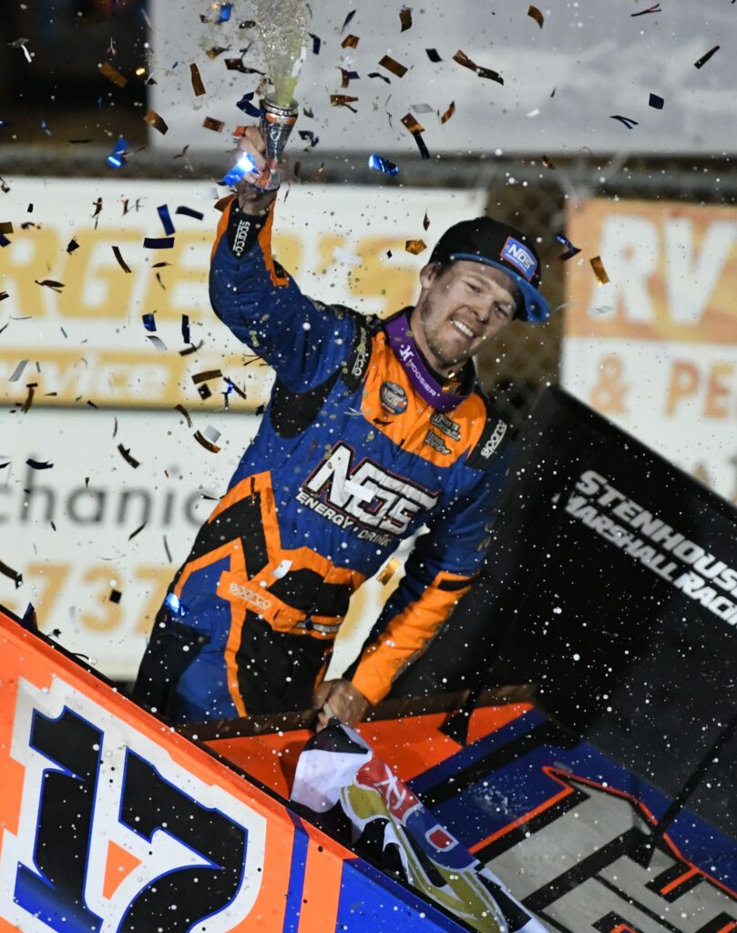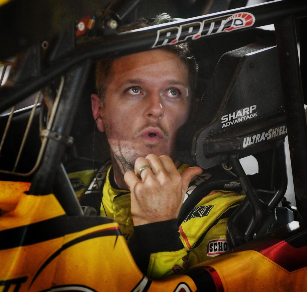 A packed pit area means it’s time for the National Open at Williams Grove. (Dennis Bender Image)Jake Dietz knows the value of eye protection at the racetrack. (Dennis Bender Image)Tyler Gee sits on his 4-wheeler contemplating what the night might bring at the Williams Grove Open. (Dennis Bender Image)Cory Eliason is locked in during time trials. (Dennis Bender Image)The fans up on Beer Hill illuminate the drivers salute to them with phones up before the National Open. (Dennis Bender Image)#83 Buddy Kofoid battles 2nd place finisher #48 Danny Dietrich during the National Open feature. Kofoid finished 5th. (Dennis Bender Image)Brent Marks signaling where he needs adjustments during the fuel stop at the National Open. (Dennis Bender Image)#17b Bill Balog on the outside tries to stay in front of eventual National Open winner #17 Sheldon Haudenschild. Balog finished 3rd. (Dennis Bender Image)Sheldon Haudenschild pops a NOS Energy drink as the confetti and champagne fly in the National Open victory Lane at Williams Grove. (Dennis Bender Image)