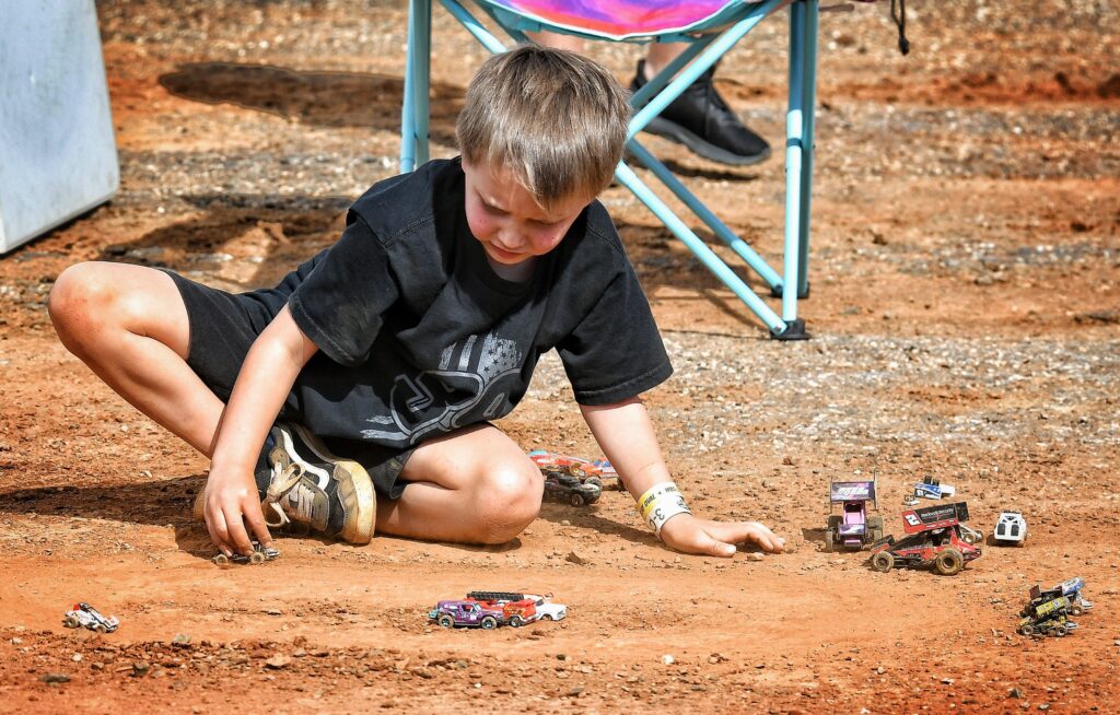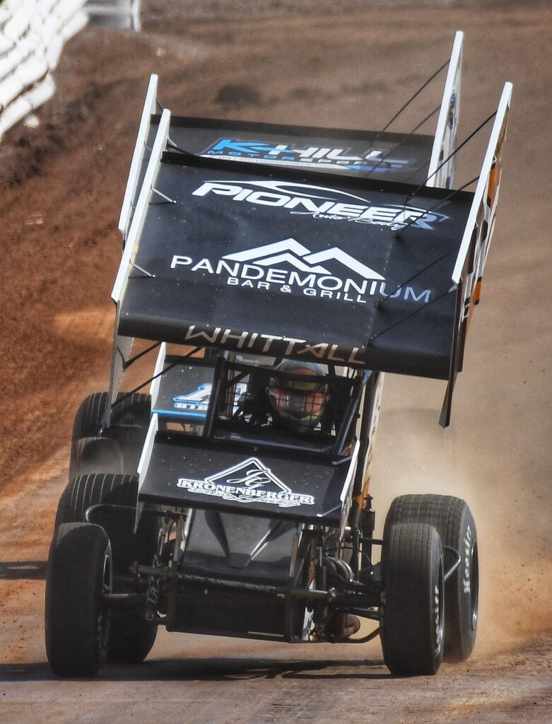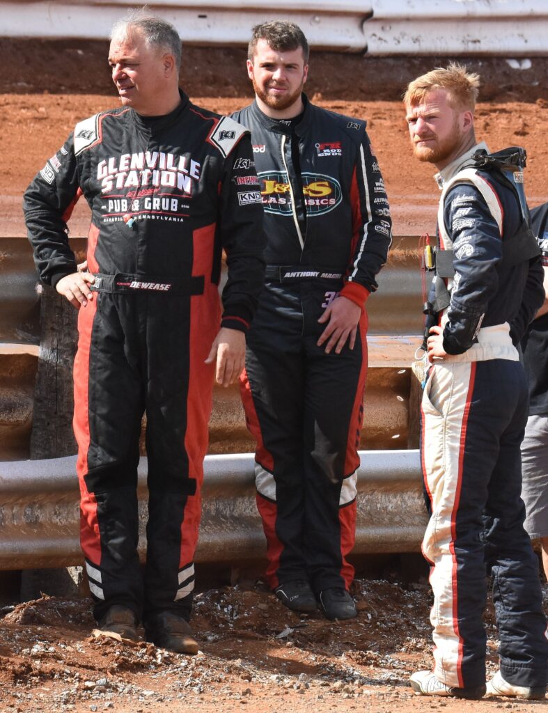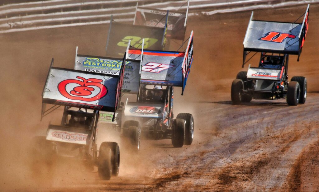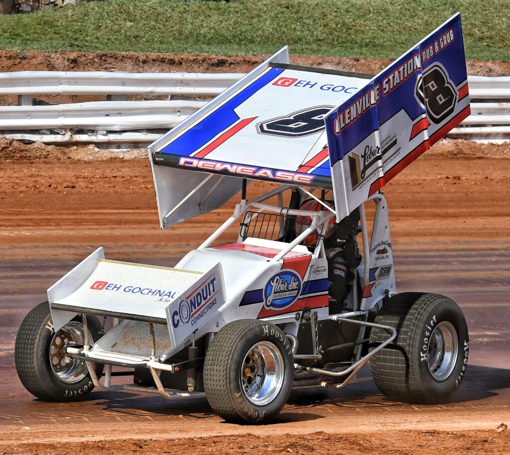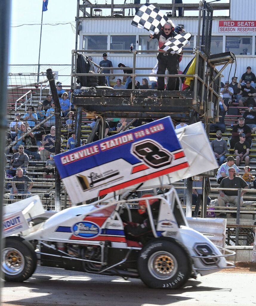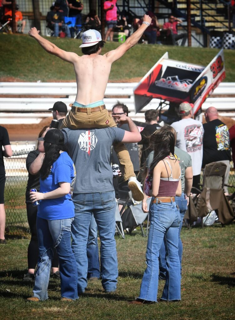 Brayden Geiges, age 7, enjoys the warm weather before the real races start at the Williams Grove Opener. (Photo Credit: Dennis Bender)Lance DeWease, Anthony Macri, and Justin Whittall confer before the feature. DeWease would go on to win, while Macri finished 9th, and Whittell 3rd. (Photo Credit: Dennis Bender)Danny Dietrich leads the pack down the back straight in heat race action on Sunday afternoon. (Photo Credit: Dennis Bender)Dylan Norris says “you can’t see me” as he follows Justin Whittall at the Grove. (Photo Credit: Dennis Bender)All is right with the world. Cold beer, warm weather, and sprint cars in central Pennsylvania. (Photo Credit: Dennis Bender)Lance DeWease rides the low line en-route to victory at the Grove. (Photo Credit: Dennis Bender)Twin checkers and the spoils of victory await Lance DeWease once again at Williams Grove. (Photo Credit: Dennis Bender)Among the spoils of victory is the champagne spray in victory lane to go with that fresh, clean, checkered flag. (Photo Credit: Dennis Bender)
